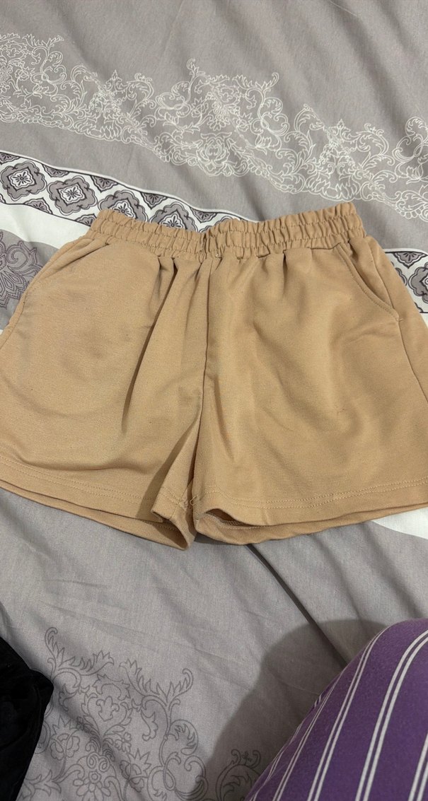 Bej pamuklu mini şort, bol kesim ve lastikli bel bandıyla günlük rahat kullanıma uygundur. Pastel tonu ile zahmetsiz şıklık sunar.