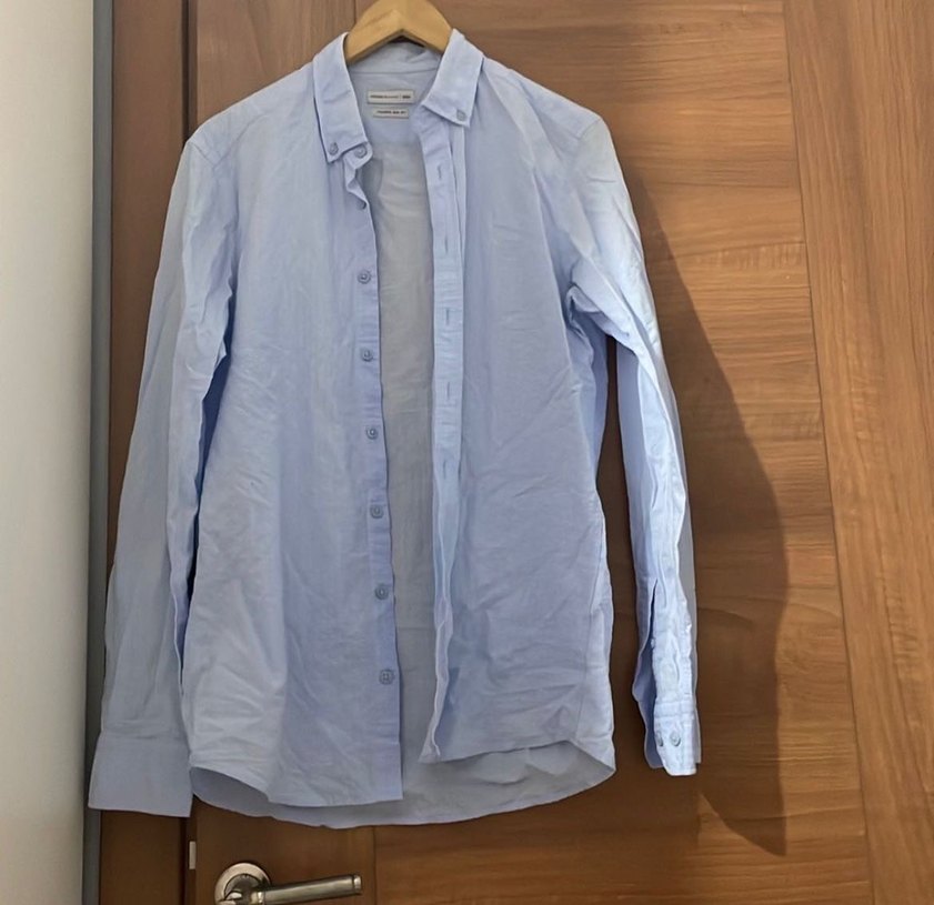 Bej renkli, yakalı ve düğmeli erkek gömlek. Yumuşak keten kumaştan, uzun kollu ve regular fit, ofis kullanımı için uygundur.