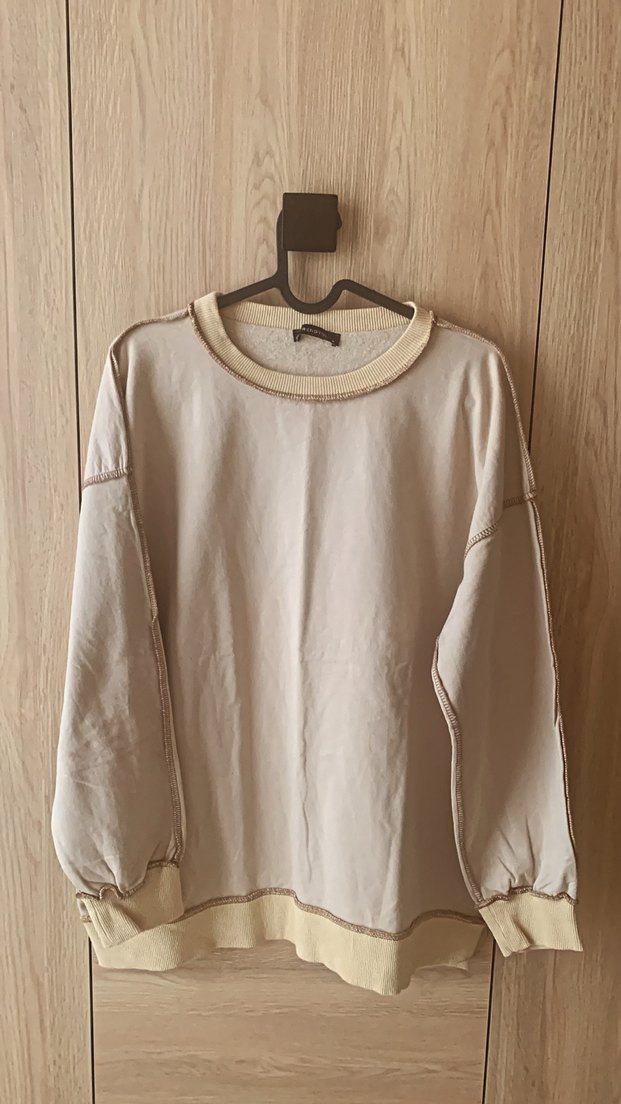 Yumuşak keten kumaştan, bej renkli, uzun kollu, bisiklet yakalı ve bol kesim basic sweatshirt. Günlük rahat kullanıma uygun, sokak stiline uyumlu.
