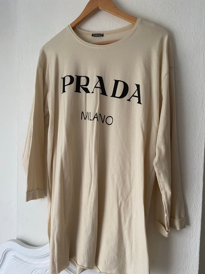 hic kullanılmamıştır Bej renkte, pamuklu kumaştan uzun kollu, bol kesim ve drapeli hamile tişörtü. Önünde 'PRADA MILAVO' baskısı bulunan, günlük rahat kullanıma uygun bir parça.