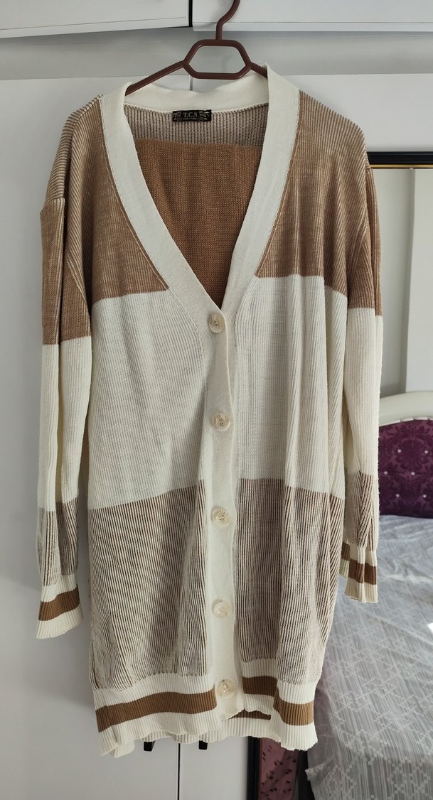 Bej renkli, pamuklu uzun triko hırka, bol kesim ve V yakaya sahip. Uzun kollu ve rahat, gündelik kullanıma uygun bohem tarzda.