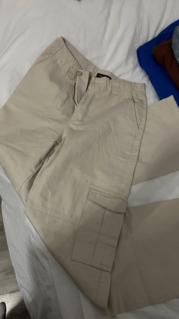 Bej renkte, pamuk kumaştan, rahat kesim ve midi boy pantolon. Günlük kullanıma uygun, desen içermeyen, sokak tarzında şık bir parça.