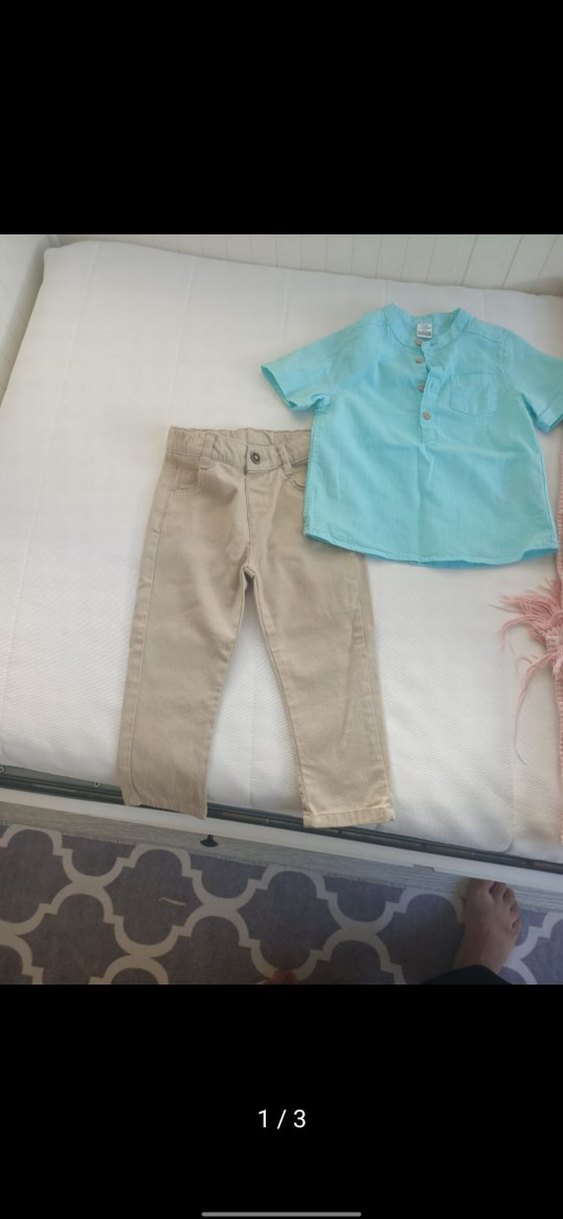 Bej pamuk pantolon ve pastel mavi kısa kollu, düğmeli, yakalı tişörtten oluşan bebek takımı. Desensiz ve rahat normcore tarzında.