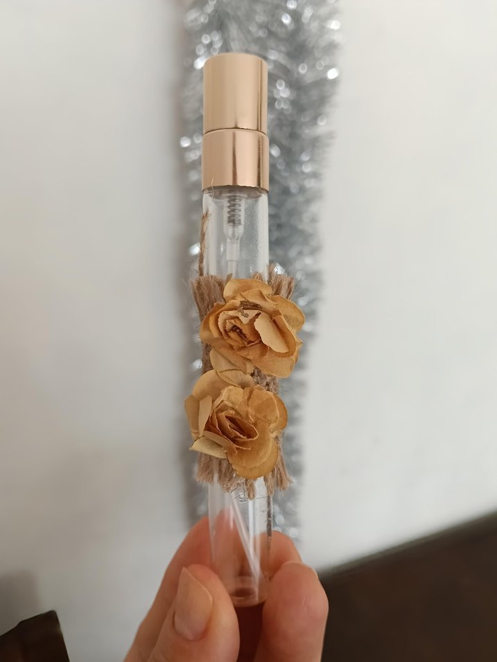 Parlak kapaklı bej parfüm şişesi, üzerindeki kurutulmuş çiçek detaylarıyla zarif bir görünüm sunar.