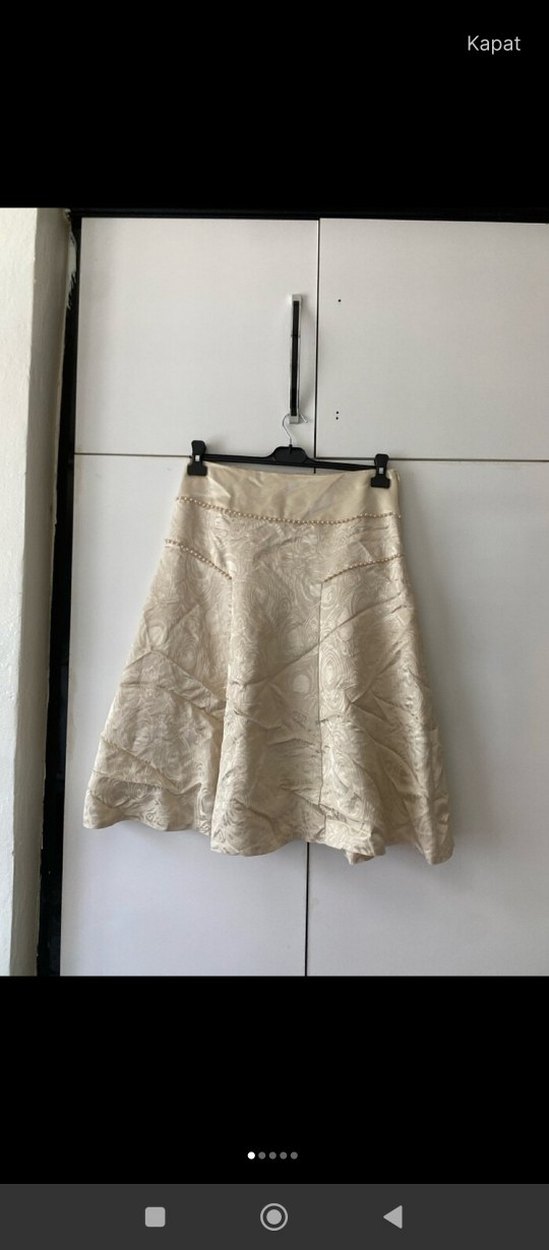 Parıltılı bej keten kumaştan, pileli ve bol kesim mini hamile eteği, ofis için şık bir seçim.