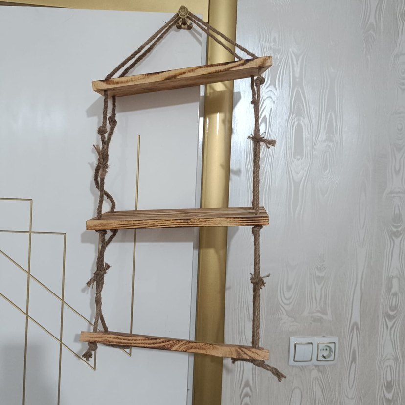 Bej parlak ahşap raf, doğal halatlarla asılan dekoratif saklama alanı sağlar.