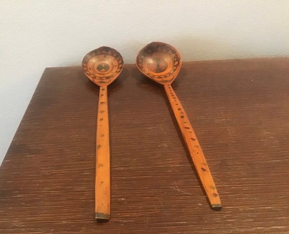 Bej parlak ahşaptan yapılmış, oyma desenli uzun saplı ve yuvarlak kaşıklar. Eski el işçiliklidir