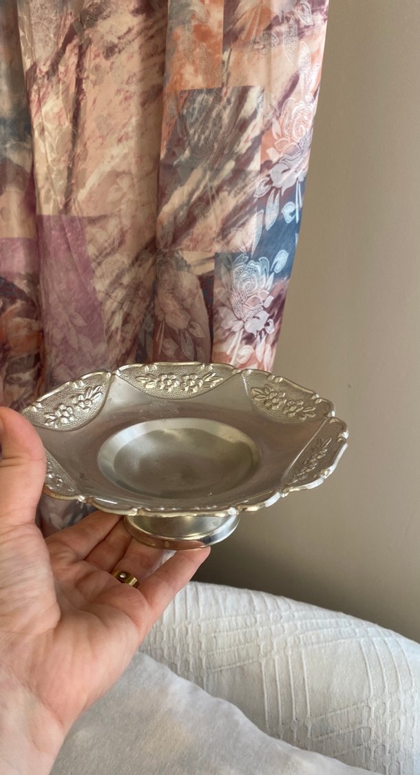 Parlak bej renkte, ayaklı ve kenarında çiçek desenli kabartmalar bulunan klasik tarzda tabak. ️