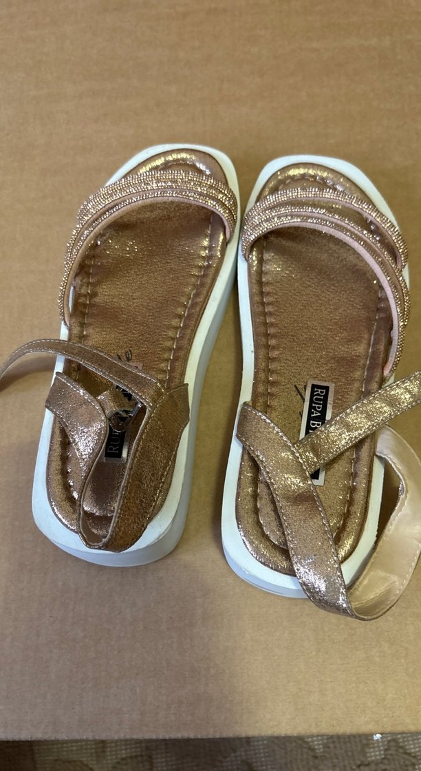 Bej renkte, parlak bantlı ve tokalı dolgu topuklu kadın sandalet. Kauçuk malzemeden, günlük sokak stili için uygundur.