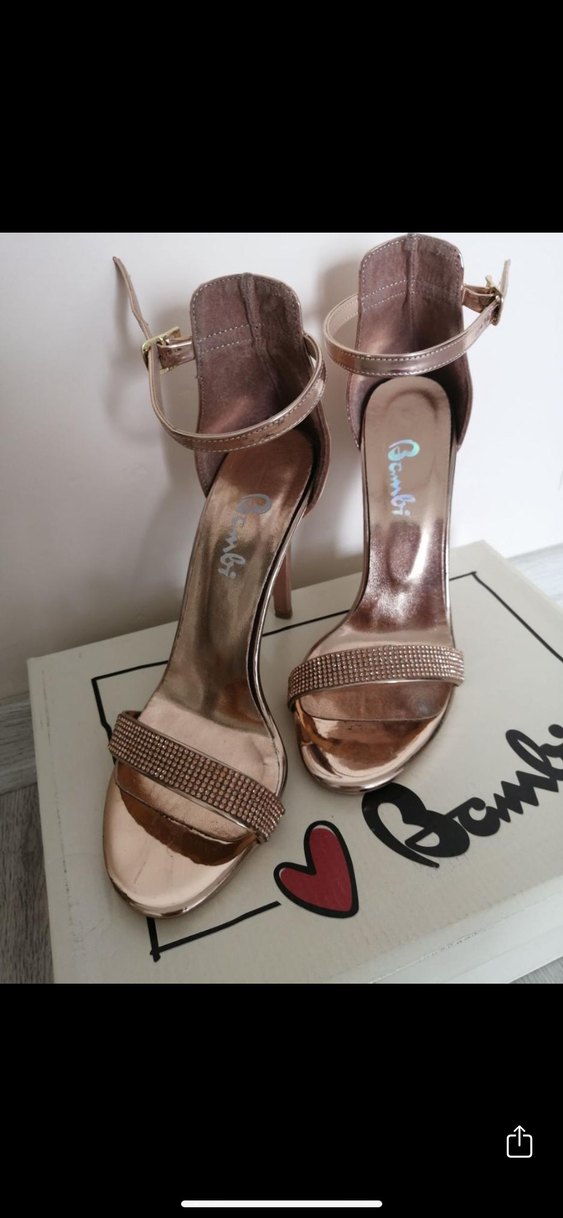 Parlak bej renkte, bantlı ve tokalı stiletto topuklu kadın ayakkabısı. Romantik akşamlar için çağdaş tarzda tasarlanmıştır. Yalnızca 1 defa giyildi