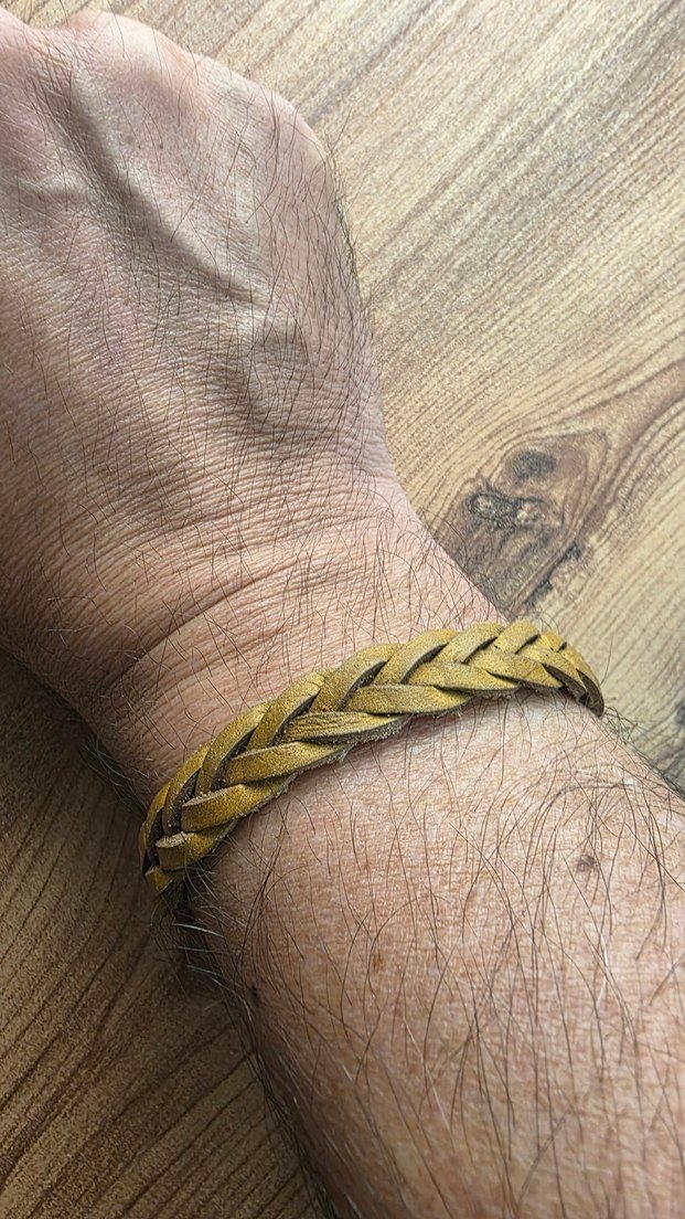 Bu erkek bileklik, parlak bej renkli örgülü tasarıma sahiptir ve minimalist, bohem tarzı yansıtır. Retro ve hippie estetiği sevenler için uygundur.gerçek deri kullanılmıştır 5,5 ve 6 cm açıkken uzunluğu 22 cm dir.