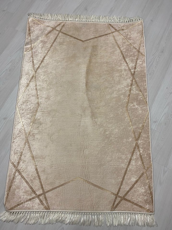 Bej renkli, parlak yüzeyli ve ince geometrik çizgili bohem tarzında halı, püsküllü kenarlarla tamamlanmıştır. Görseldeki gibidir . Ölçüleri 124x75 tir. Yeni yikandi temiz sorunsuz