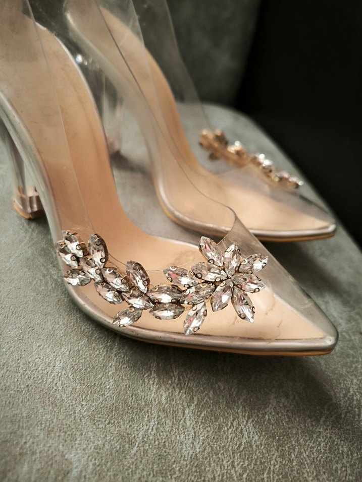Cam malzemeden yapılmış, parlak desenli ve taşlı süslemelere sahip bej stiletto topuklu kadın abiye ayakkabı, düğün ve özel anlar için uygun. bi kaç giyildi herhangi bi deformesi yoktur