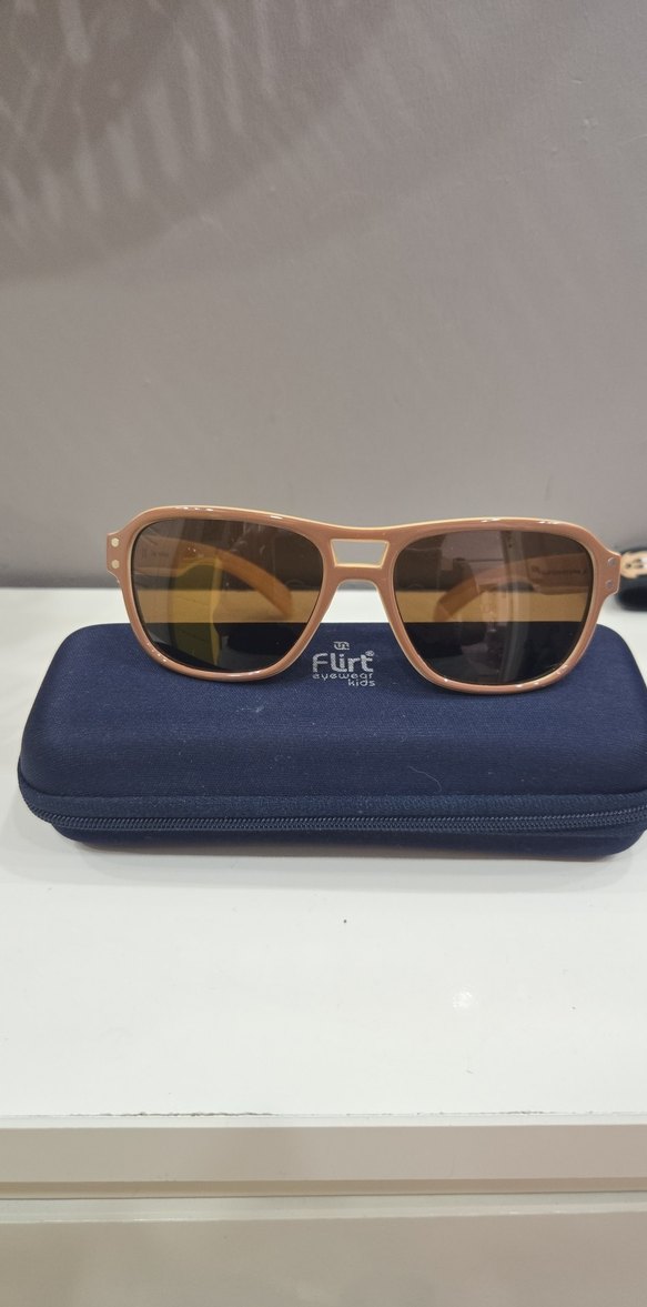 Klasik dikdörtgen çerçeveli, bej parlak çocuk güneş gözlüğü. Trendy casual tarz için uygun. Koruyucu kılıf ile birlikte. ️çok minik çizik mevcut