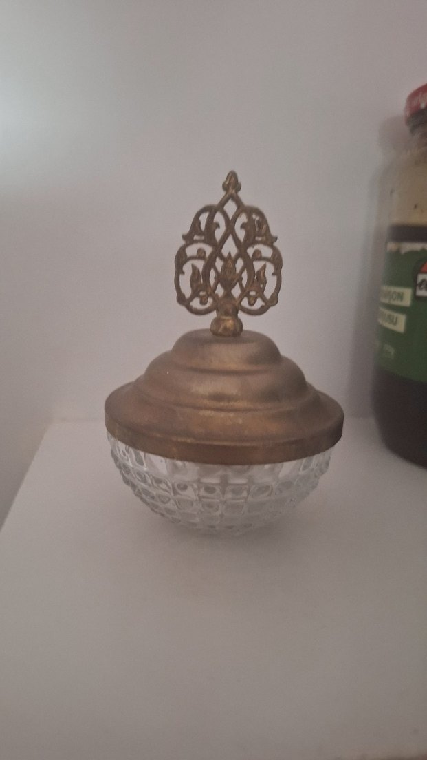 Cam tabanlı, üzeri işlemeli metal kapaklı bej parlak dekoratif vazo. Vintage havası katıyor.