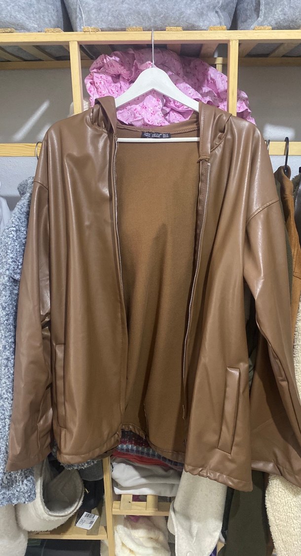Bu bej deri kadın ceket parlak görünüme, uzun kollara ve yuvarlak yakaya sahiptir. Bol kesim ve fermuarlı önüyle günlük kullanıma uygundur. ✨