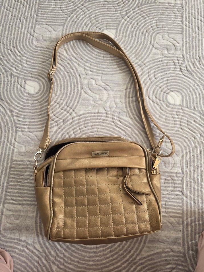 Bej parlak deri omuz çantası, tokalı detaylara sahip. Kapitone deseniyle sade ve şık, günlük sokak modasına uygun.