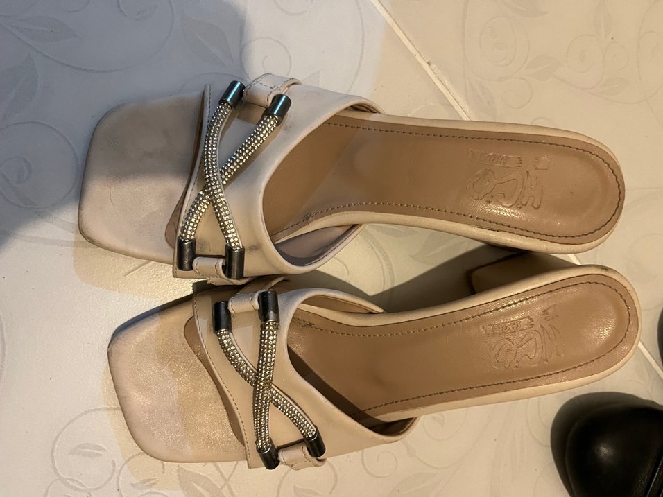Bej renkli, parlak yılan derisi desenli, tokalı detaylara sahip deri blok topuklu kadın ayakkabısı. Günlük kullanıma uygun modern Paris tarzı.