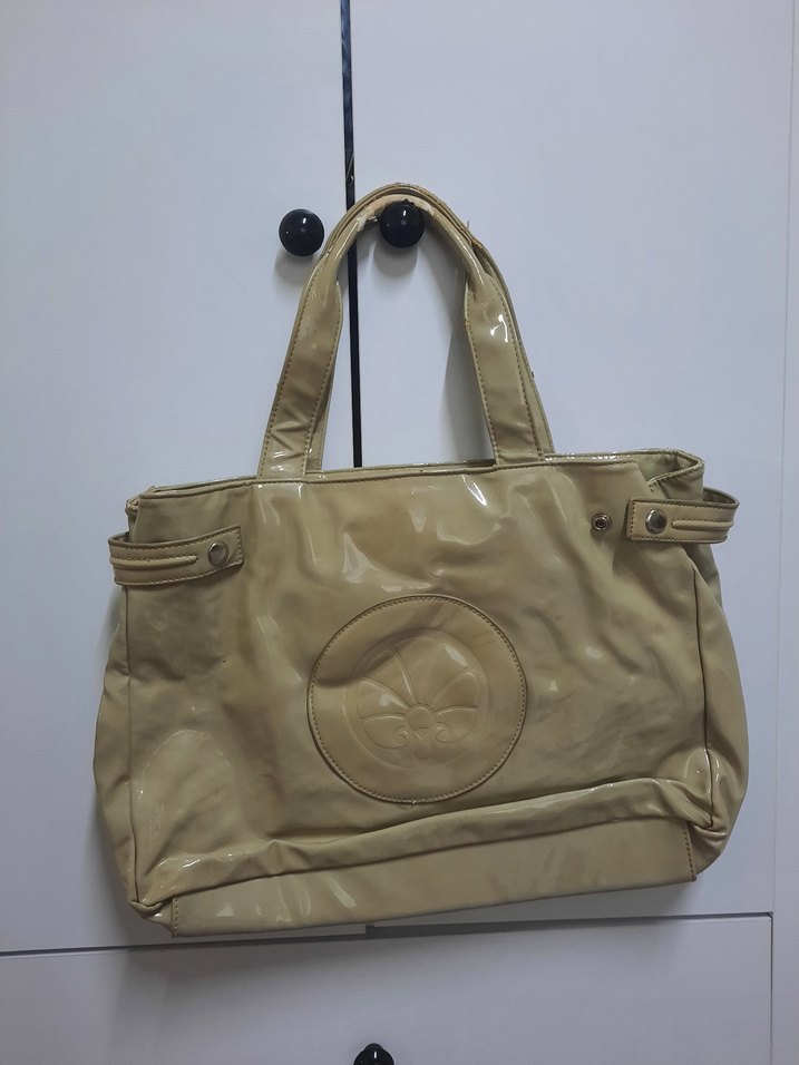 Bej parlak deri, tokalı detaylara sahip kadın çanta, minimalist tasarımıyla trend sokak stiline uygun. İçinde kalem lekeleri var askısında derisi soyulmuş.