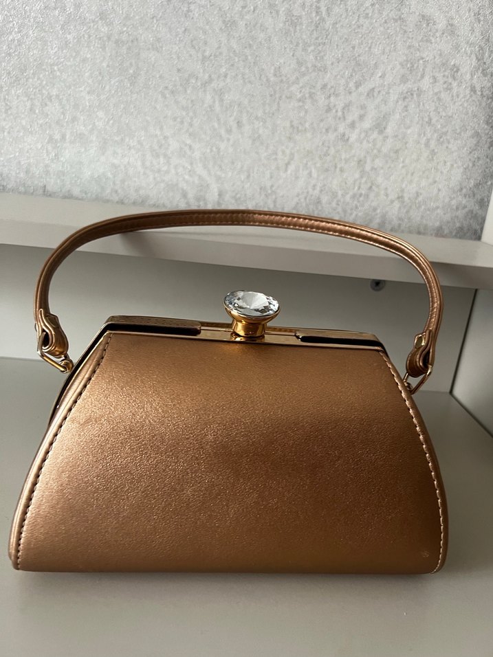 Bej parlak deri, tokalı saplı kadın portföy çanta. Modern klasik tasarıma sahip, düğünler için uygun, desensiz yüzeye ve taş görünümlü kapama detayına sahiptir.