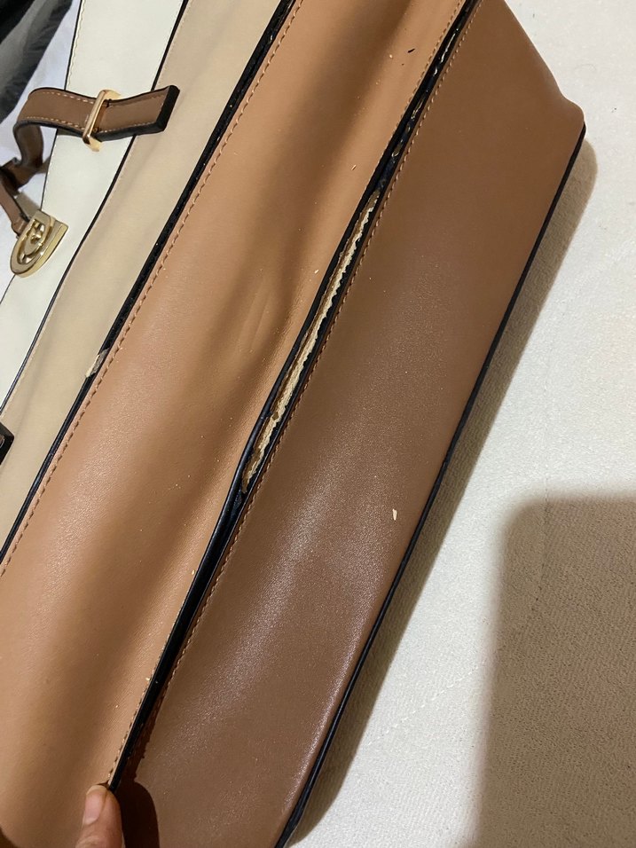 Parlak deri bej renkte, tokalı kayışlı kadın çanta. Çağdaş stiliyle ofis kullanımı ve klasik zarafete uygundur. Ön siyah şerit kısmında bir dökülme var ama orası çantacıya boya ile kapattırılır