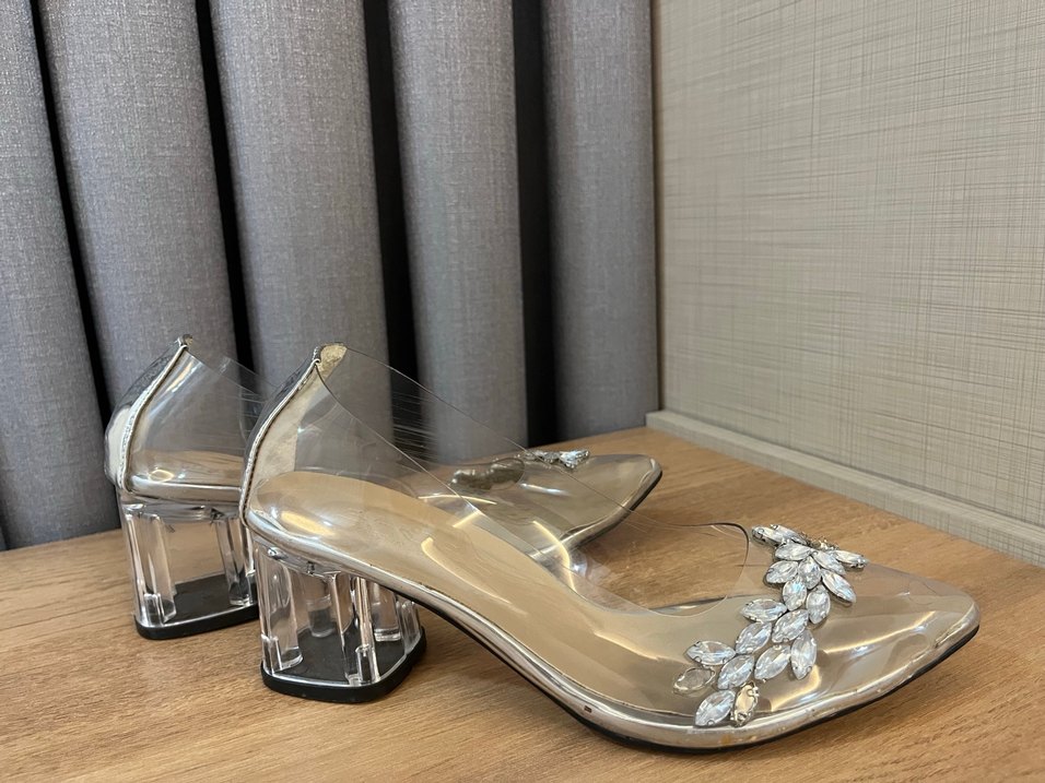 Plastik malzemeden, parlak, işlemeli taş detaylı kadın topuklu ayakkabı. Düğün ve özel anlar için uygundur.