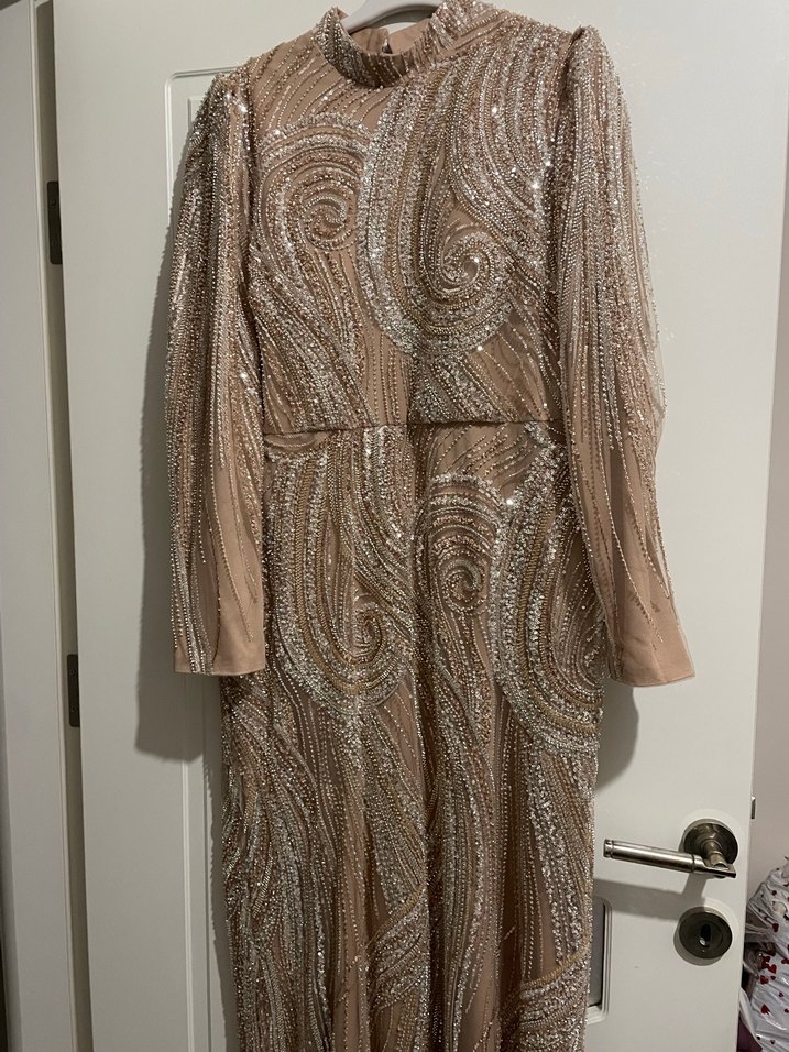 Bej renkli, yüksek yakalı ve uzun kollu bu dar kesim abiye elbise, parlak desenli drapelerle süslenmiştir. Düğün ve özel davetler için uygundur.✨