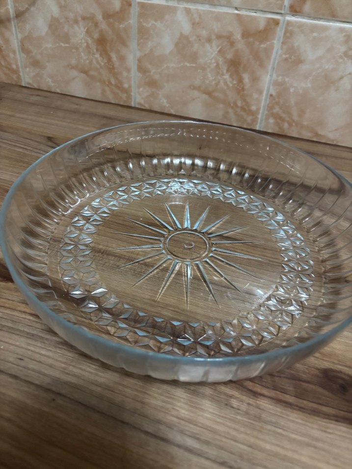 Basit, desensiz tasarıma sahip parlak bej cam tabak. Alt kısmında hafif dekoratif detay bulunur. Sunum için uygundur. ️