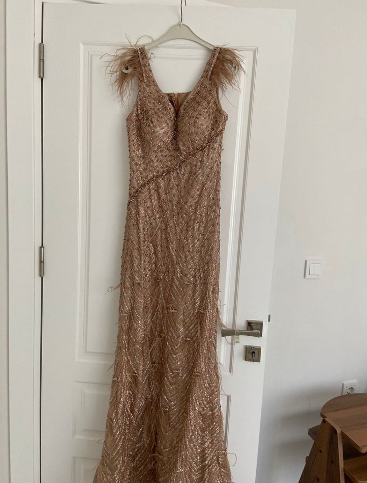 Bej Parlak Drapeli Uzun Abiye Elbise - Görsel 1
