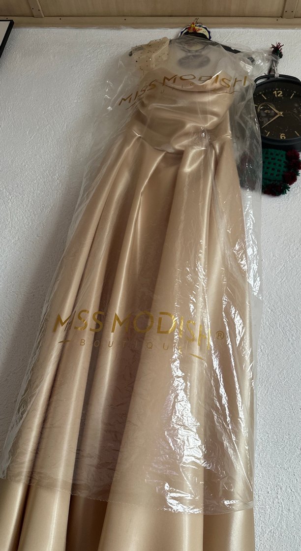 Bej renkli, parlak dokulu, drapeli ve straplez yakalı uzun abiye elbise. Kolsuz ve bol kesim olup düğün gibi özel günler için uygundur. Bir kez giydim kuru temizlemede detay temizlendi tertemizdir