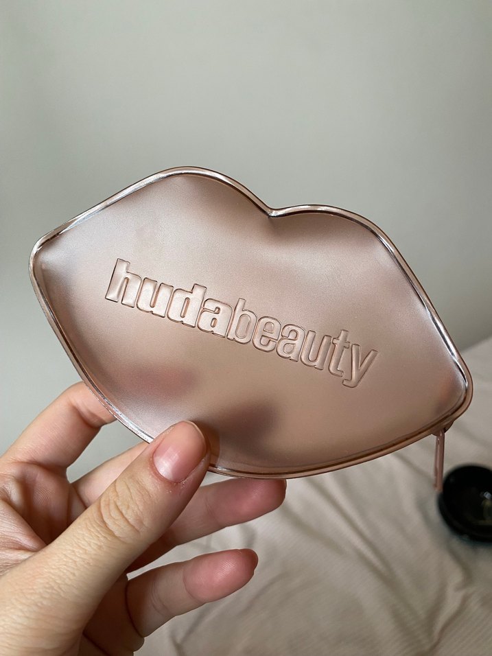 Plastik malzemeden yapılmış, dudak şeklinde, parlak bej makyaj çantası. Minimalist baskılı tasarıma ve "hudabeauty" logosuna sahiptir.