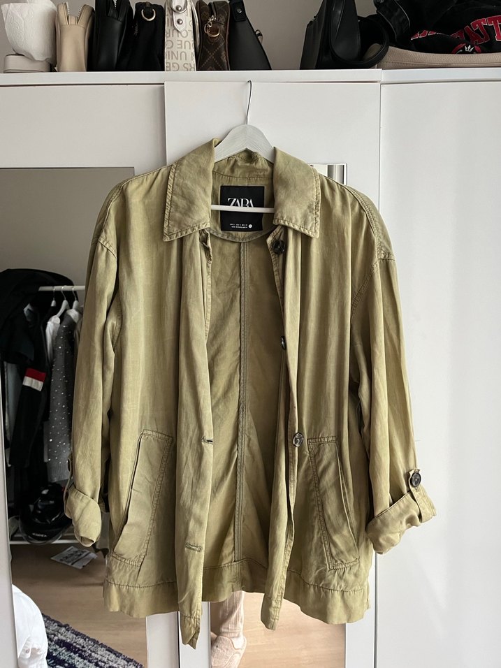 Bej parlak keten kumaştan, düğmeli, geniş kesim, yaka detaylı, uzun kollu kadın ceket. Günlük sokak stili için uygundur.