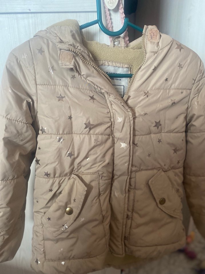 Bej renkli, düğmeli ve kesimli yakalı kız montu. Yumuşak, sıcak kumaştan, parlak yüzeyli ve yıldız desenli.