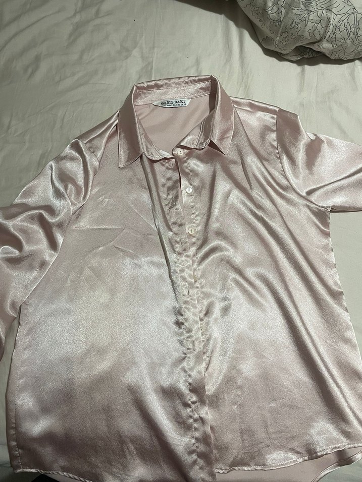 Bej parlak saten kumaştan, düğmeli ve kısa kollu, yakalı, bol kesim midi boy bluz. Rahat ve şık günlük sokak stili için uygundur. ✨