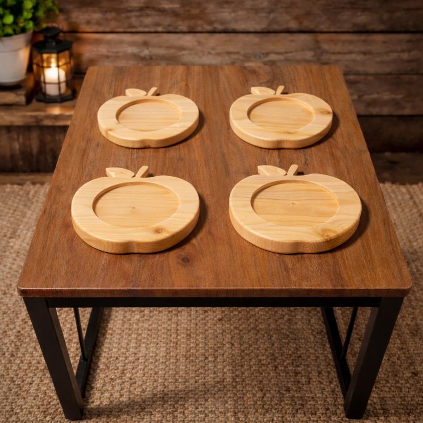 Parlak bej renkli, elma şekilli, desen içermeyen dört adet ahşap bardak altlığı seti.