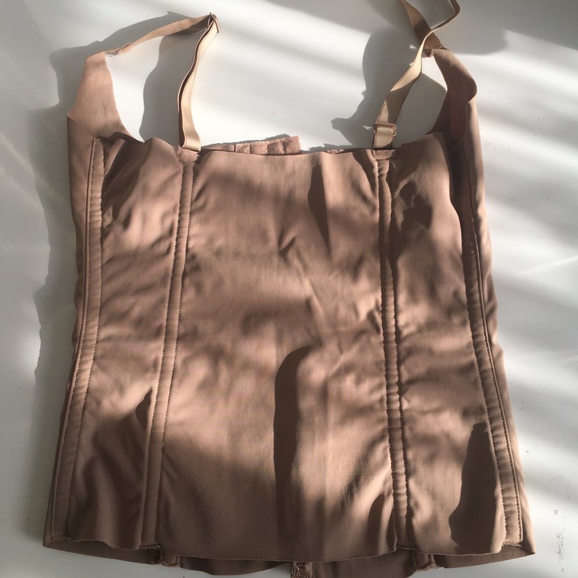 Bej renkli, parlak görünümlü, vücuda oturan ve midi boyda emzirme korsesi.
