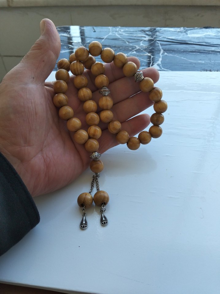 Bej Parlak Erkek Tesbih - Bohem Tarzı AĞAÇ İRİ TANELİ TESBİH