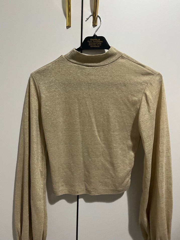 Bej Parlak Fitilli Triko Balıkçı Yaka balon kol bluz