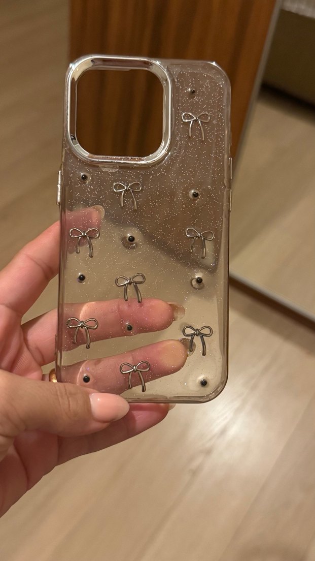 Bej renkte, parlak detaylara ve küçük fiyonk süslemelere sahip telefon kılıfı. Sokak modası stilinde şık bir görünüm sunar. 15 pro telefon kılığı