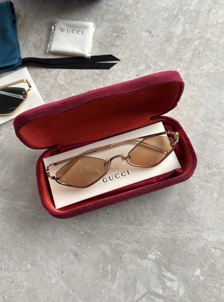 Gucci'nin bej parlak çerçeveli kadın güneş gözlüğü, klasik Paris sokak modasını yansıtıyor. Kırmızı kadife kutu ve temizleme bezi ile birlikte gelir. ️