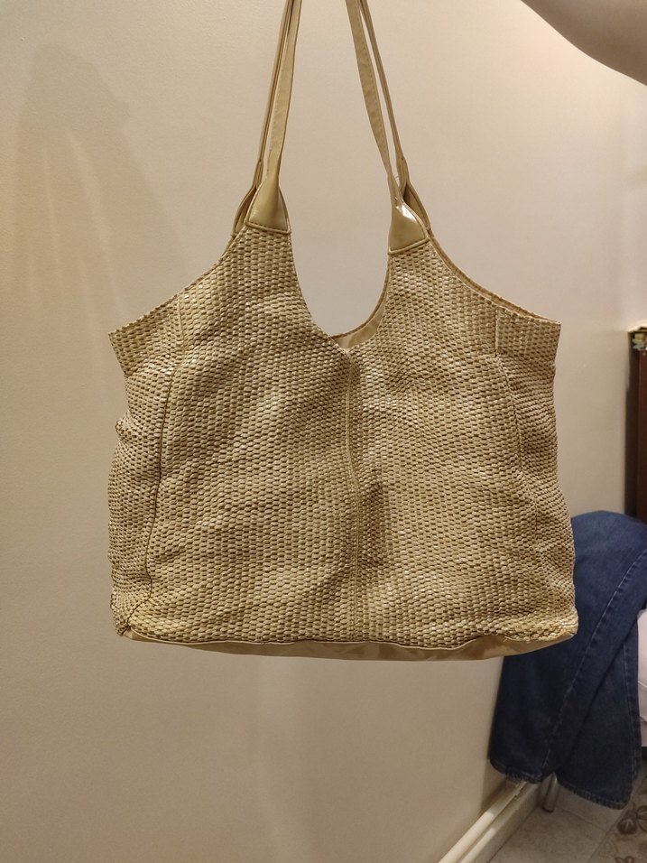 Bej renkli, parlak hasır dokusuyla kadın çantası. Minimalist ve bohem tarzda, rahat ve şık bir görünüm sunar. hafif defoları var düğmesi kopmuş ama dikilebilir hala içinde. hasır oldupu için bazı yerlerde defolar var alışveriş veya plaj çantası olarak kullanılabilir
