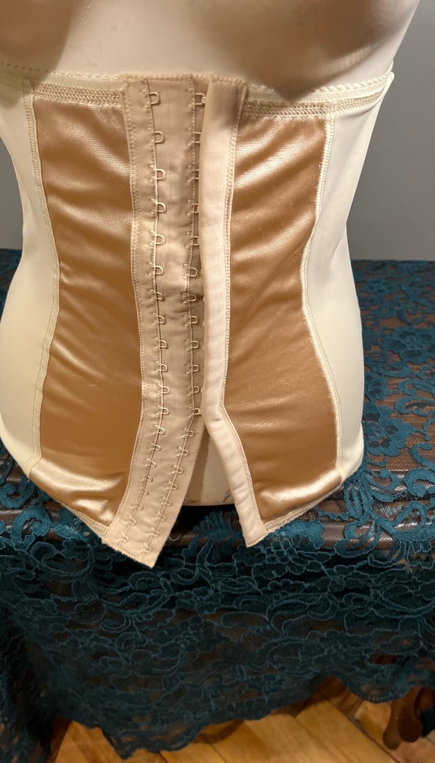 Bej renkli, parlak yüzeyli ve midi boyda, düz desensiz, önden kancalı kapamalı, vücuda oturan hemşire korsesi.