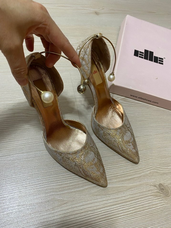 Kadınlar için ince topuklu abiye ayakkabı, parlak bej yılan desenli ve dantel detaylıdır. İnci süslemeli bilek bantları bulunur, düğünler için uygundur. ✨