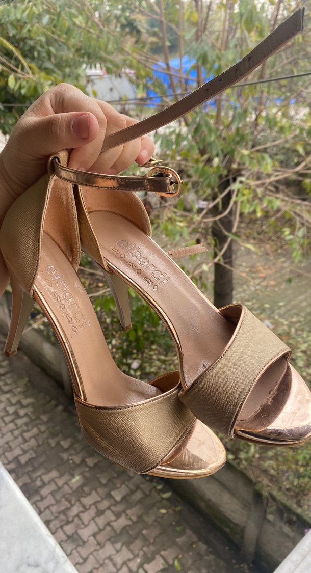 İnce topuklu, parlak bej renkli abiye ayakkabı. Yılan desenli ve bağcıklı bilek bantlı, ipeksi dokulu, düğünler için uygundur.