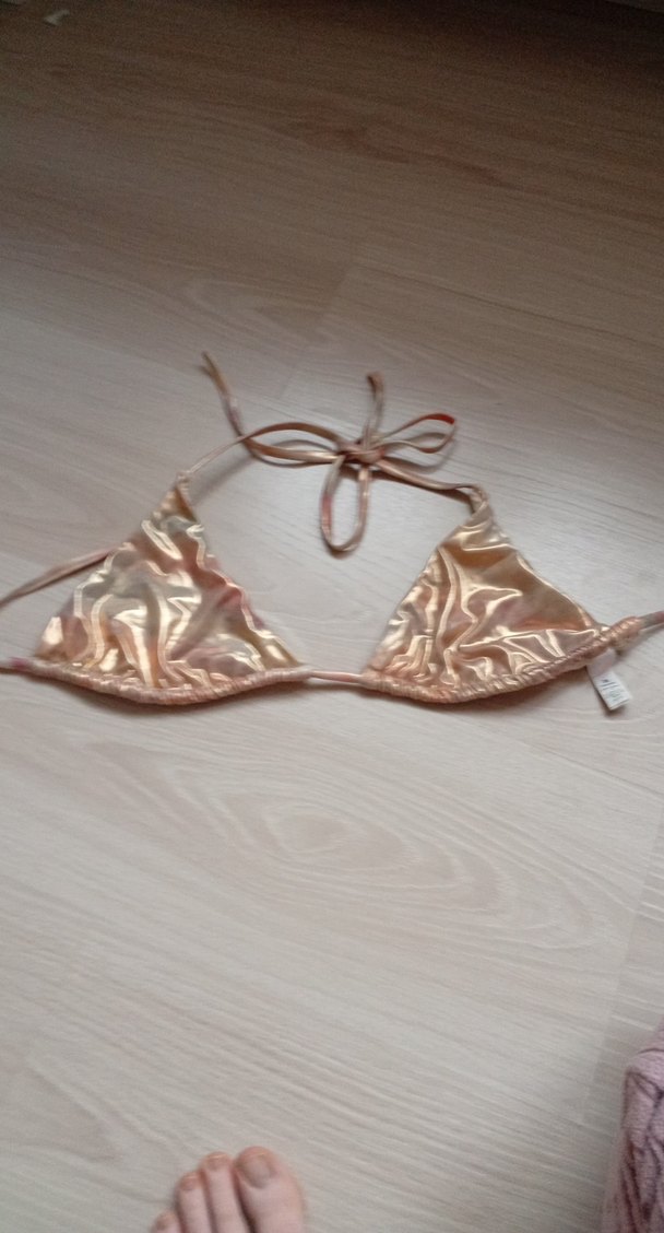 Bej renkli, parlak kumaşlı ve ip askılı mini bikini üstü, vintage bohem tarzıyla parti için uygun şık bir seçim. ✨