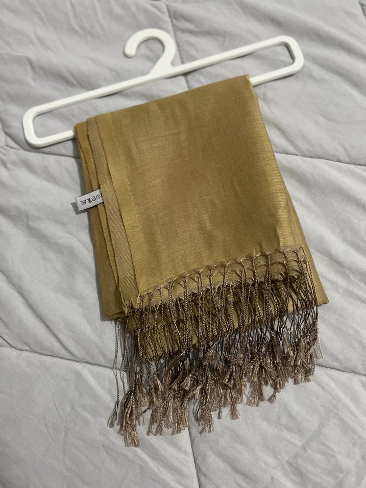 İpek dokulu, parlak bej renkte, püsküllü ve drapeli kadın şalı, bohem ve retro tarzına uygundur.