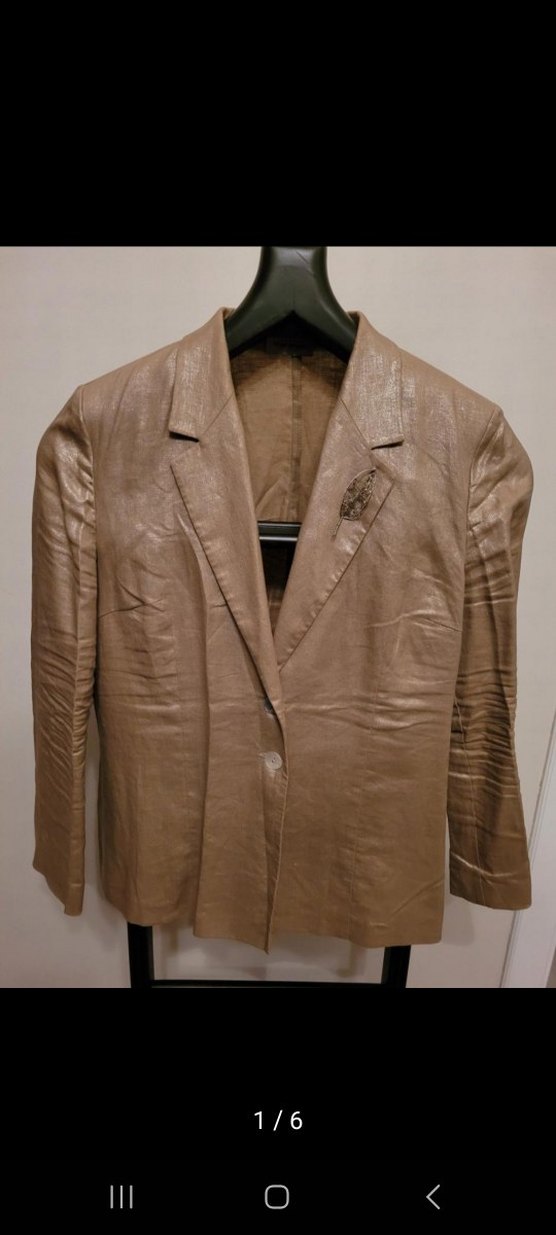 Bej renkli, parlak blazer ceket, erkek yaka ve düğmeli ön kısmıyla öne çıkar. Uzun kollu, midi boy ve normal kesimdir.