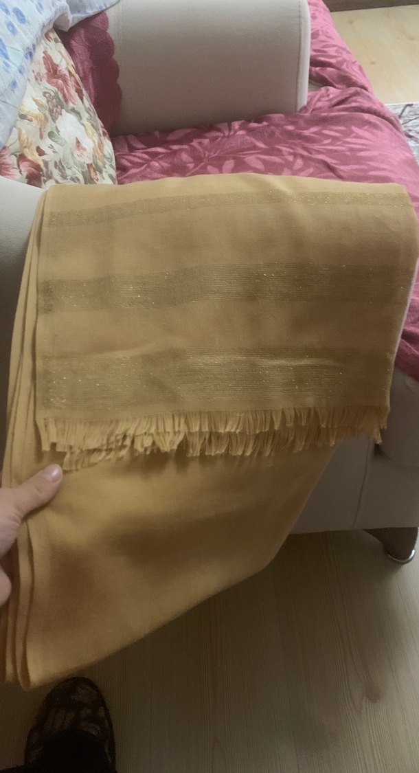Yumuşak sentetik kumaştan bej kadın şal, salaş ve parlak detaylara sahip, püsküllü kenarlarıyla bohem ve rahat bir tarz sunar.