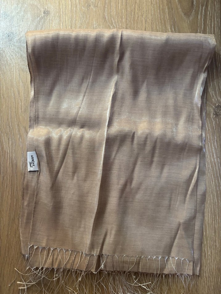 Bu bej kadın şal, parlak ve saten dokusuyla drapeli detaylara sahip, rahat bohem tarzını yansıtıyor. Retro ve hippie görünüme uygun. ✨
