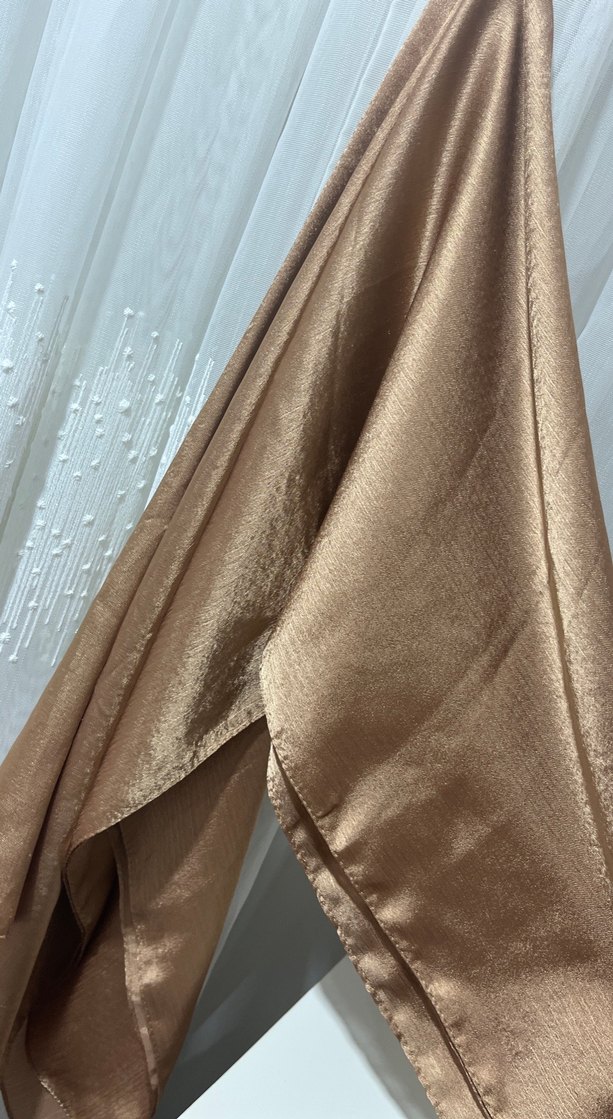 Parlak bej renkte, saten dokulu, drapeli tasarıma sahip kadın şalı, rahat ve çağdaş bir görünüm sunar.